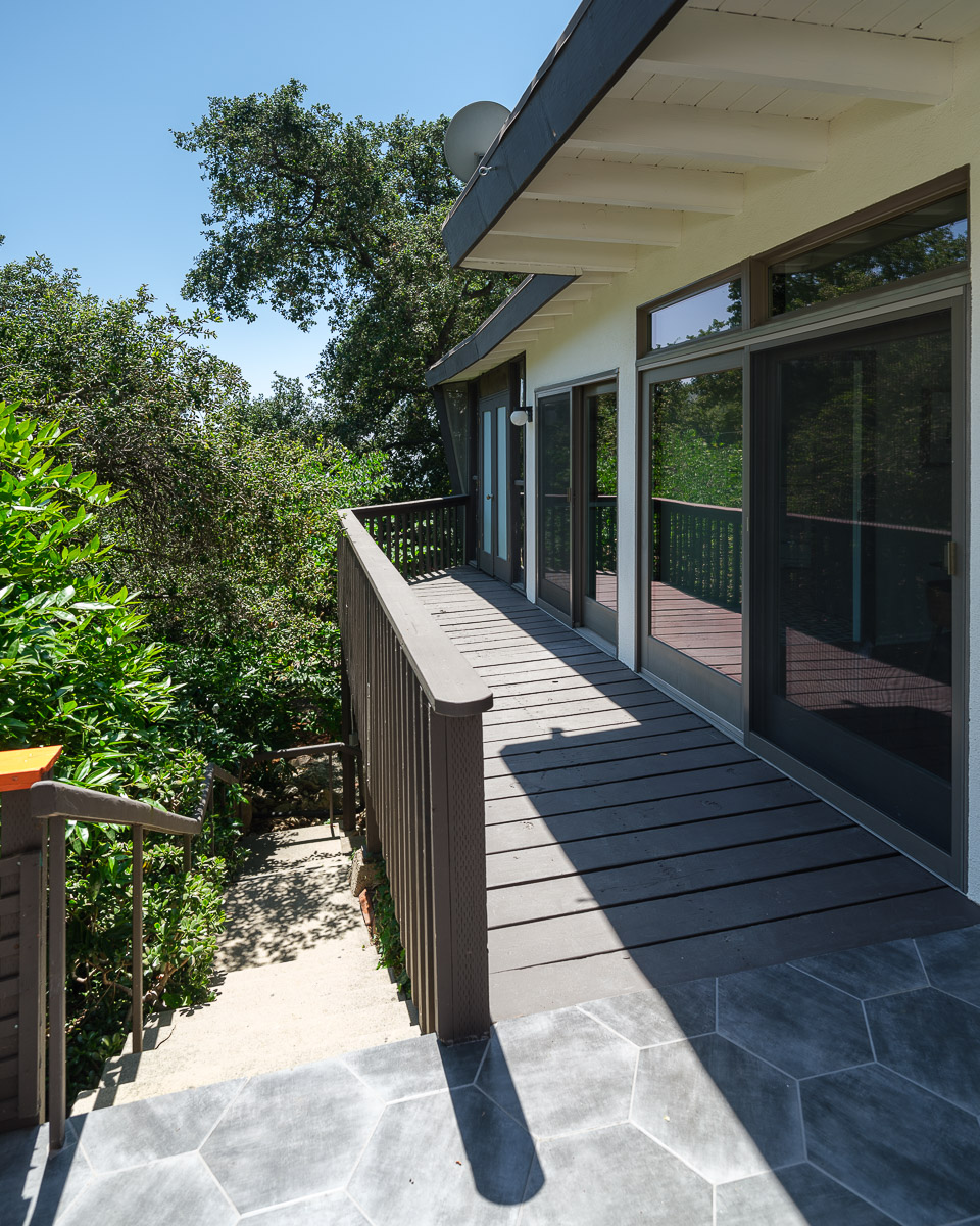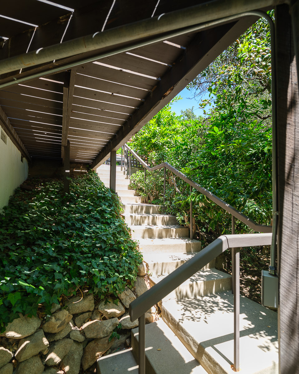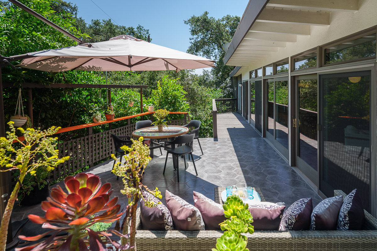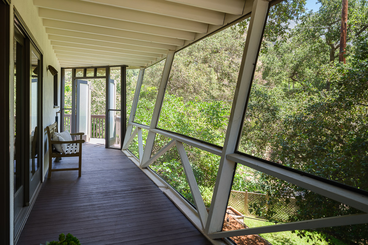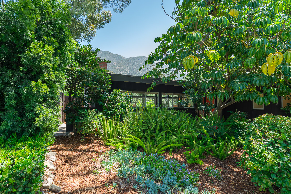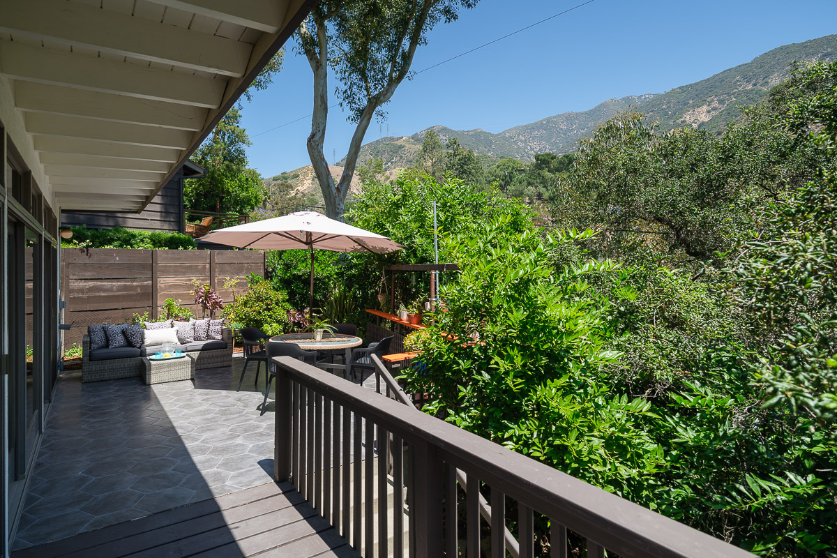 The exterior of the house is accessed from numerous sets of tall glass doors that frame the sweeping views of our majestic San Gabriel Mountains. Enjoy the raised deck and patio area while entertaining friends or for simply relaxing with the morning paper. It is idyllic and steps down to the shade-dappled, terraced yard that beckons you with its serenity and grace, all in a once in a lifetime location. Don’t miss this true Altadena beauty.