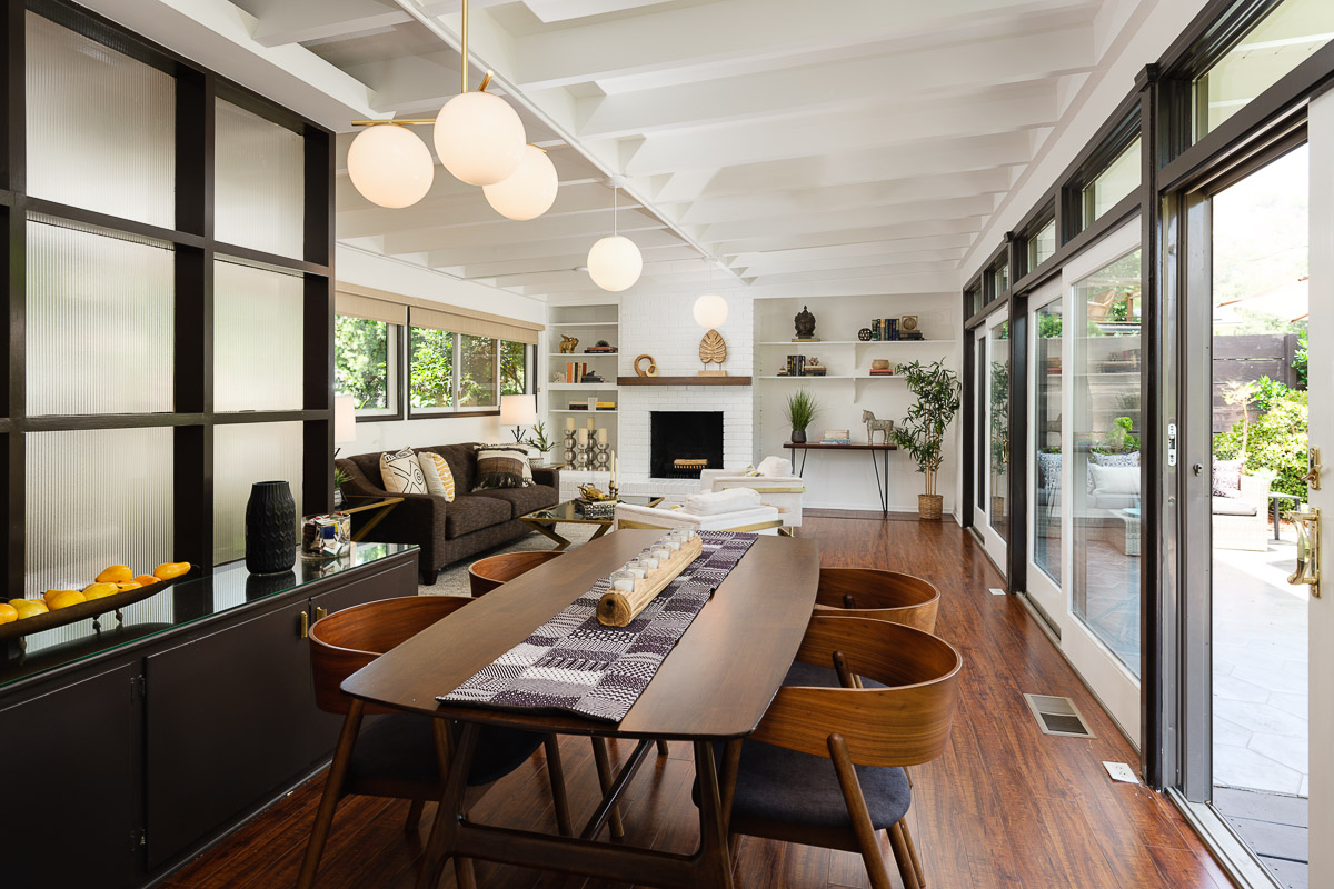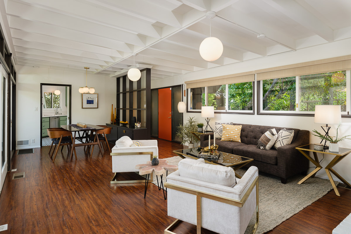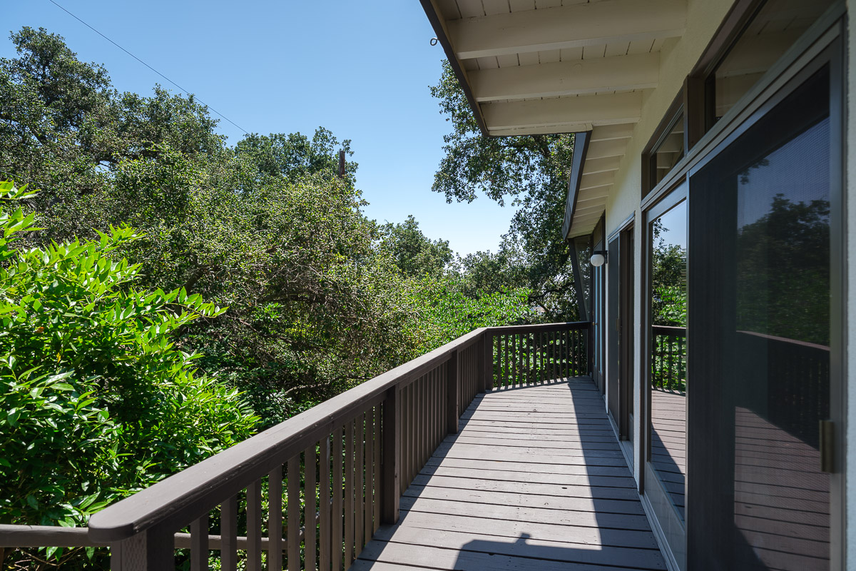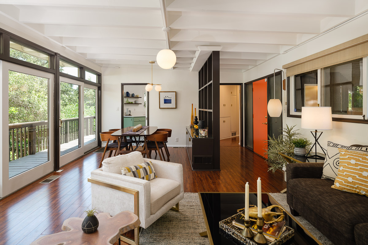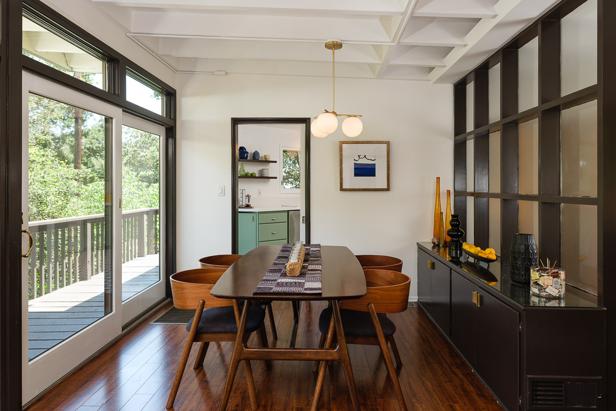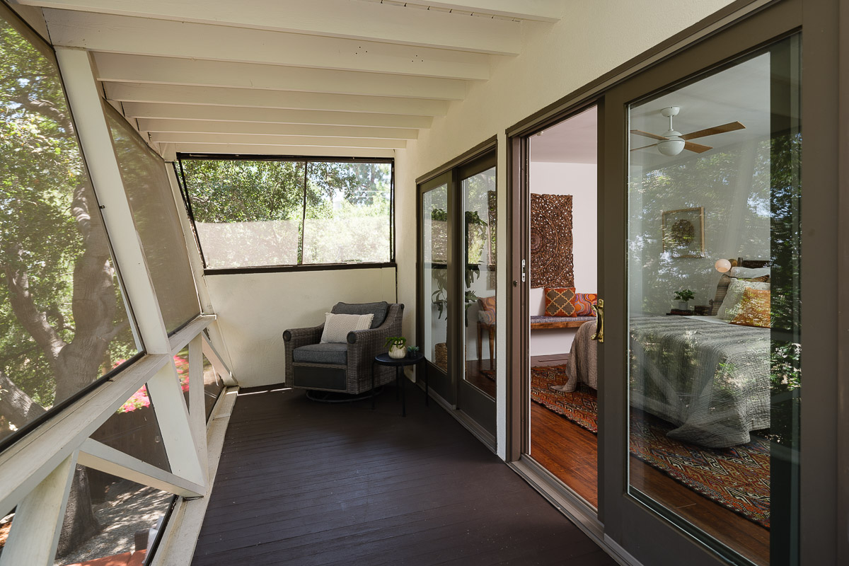You step into the architectural home via a tall door flanked by period, reeded glass panels. As you enter the residence, wrapped in windows, you are led to the elegant living room with beamed ceilings as well as a stately fireplace. This adjoins the inviting dining area and kitchen that has been recently remodeled. This upper floor also features a renovated bath and two bedrooms, including a primary bedroom that opens out to a wide balcony that showcases tree-top views of the beautiful surroundings. The bottom floor is bonus space and would be ideal as a separate guest suite or office. This property is filled with character details and fixtures throughout including custom built-ins, clerestory windows and mid-century lighting that complete the picture-perfect interior.