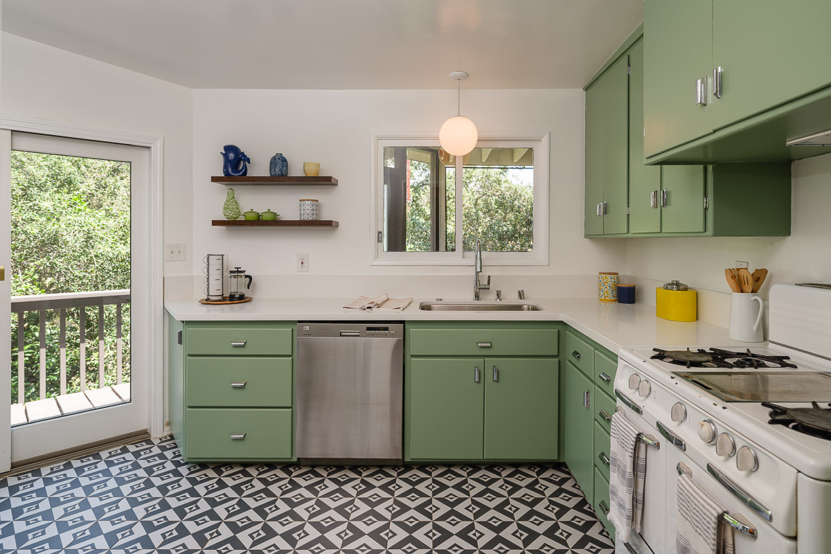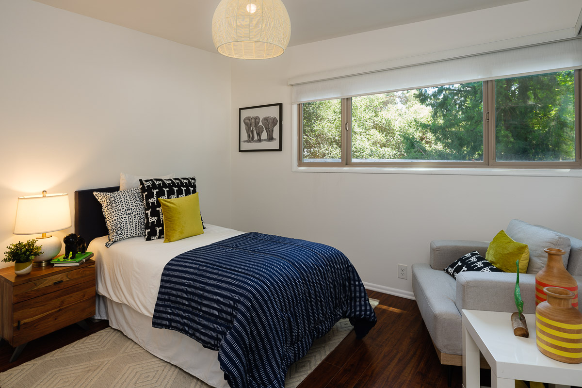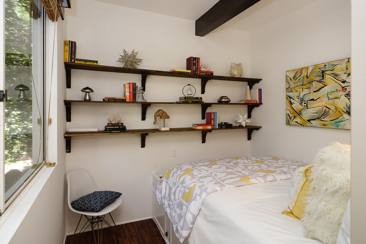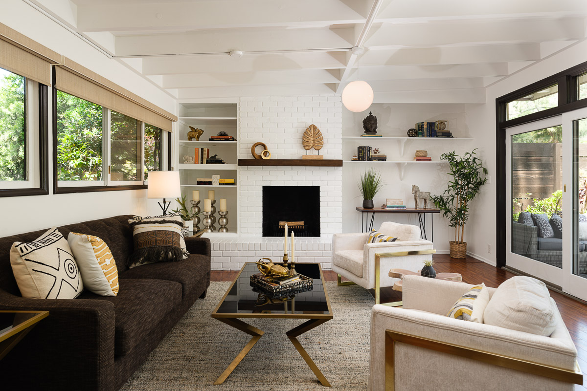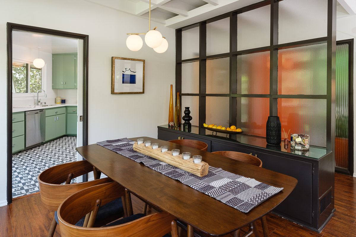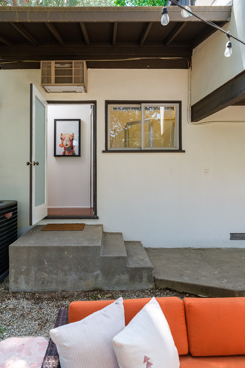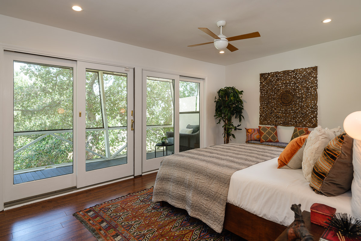 You step into the architectural home via a tall door flanked by period, reeded glass panels. As you enter the residence, wrapped in windows, you are led to the elegant living room with beamed ceilings as well as a stately fireplace. This adjoins the inviting dining area and kitchen that has been recently remodeled. This upper floor also features a renovated bath and two bedrooms, including a primary bedroom that opens out to a wide balcony that showcases tree-top views of the beautiful surroundings. The bottom floor is bonus space and would be ideal as a separate guest suite or office. This property is filled with character details and fixtures throughout including custom built-ins, clerestory windows and mid-century lighting that complete the picture-perfect interior.